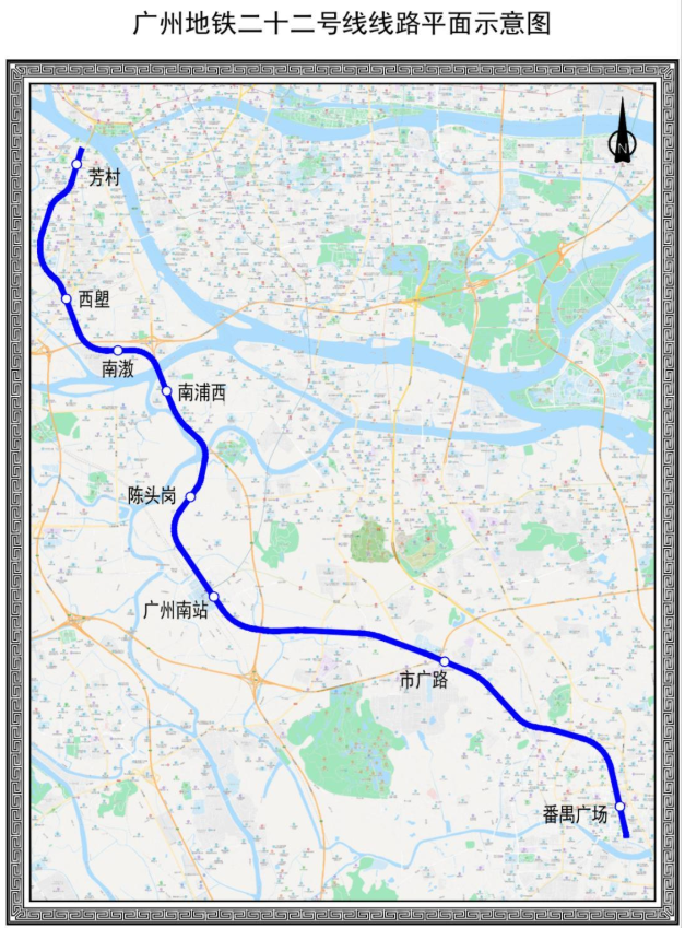 广州22号线全长29.7公里,设车站8座,其中换乘站4座,定位为时速160公里的南站快线。其中,广州22号线首通段(番禺广场-陈头岗)已于2022年3月31日洞开运营,后通段(陈头岗-芳村)将于月底洞开运营。
