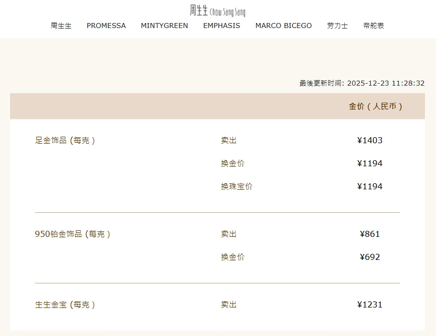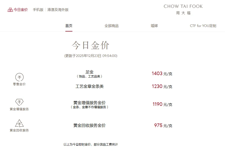 周大福足金饰品标价1403元/克,较前一日1367元/克的价钱高潮36元/克。