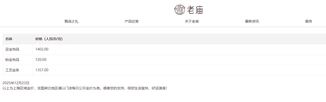 老庙黄金足金饰品标价1402元/克,较前一日1367元/克的价钱高潮35元/克。